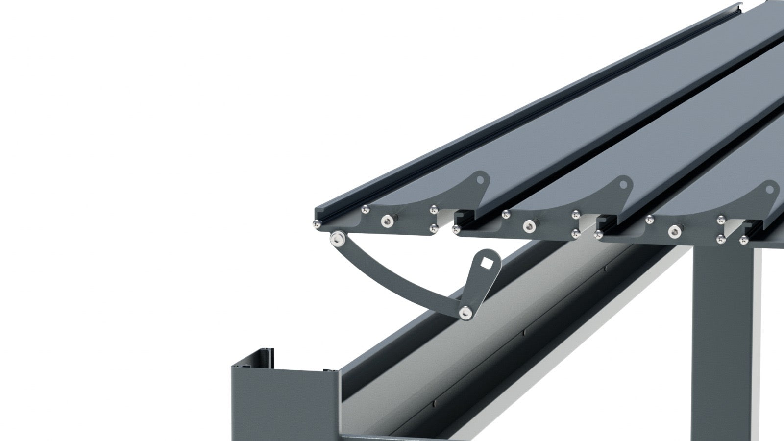 Double layer roof louvers thick gauge aluminium with factory assembled end fins. Each roof louver adds interlocks with the beams adding to structural integrity of the pergola. Unlike most others which simply sit on top of the structure.